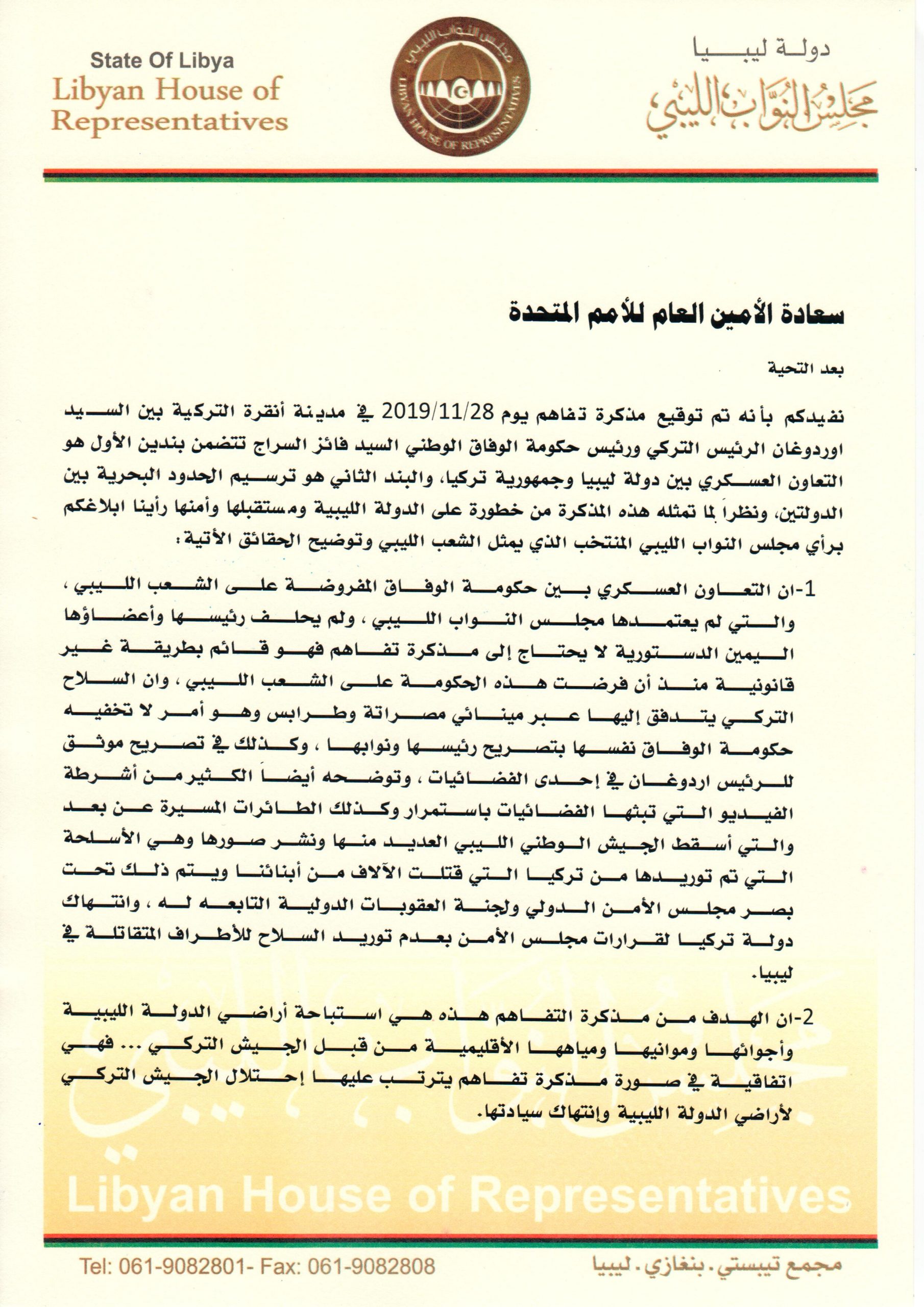 وجه فخامة رئيس مجلس النواب المستشار “عقيله صالح” خطابا لسعادة الأمين العام للأمم المتحدة بشأن توقيع مذكرة تفاهم الموقعة من رئيس حكومة الوفاق فائز السراج مع الرئيس التركي “أردوغان” التي تضمنت في البند الاول التعاون العسكري والبند الثاني ترسيم الحدود البحرية بين دولة ليبيا و الجمهورية التركية، لما تمثله هذه المذكرة من خطورة على الدولة الليبية ومستقبلها وأمنها، موضحاً رأي مجلس النواب لعدد من الحقائق حول هذه المذكرة.