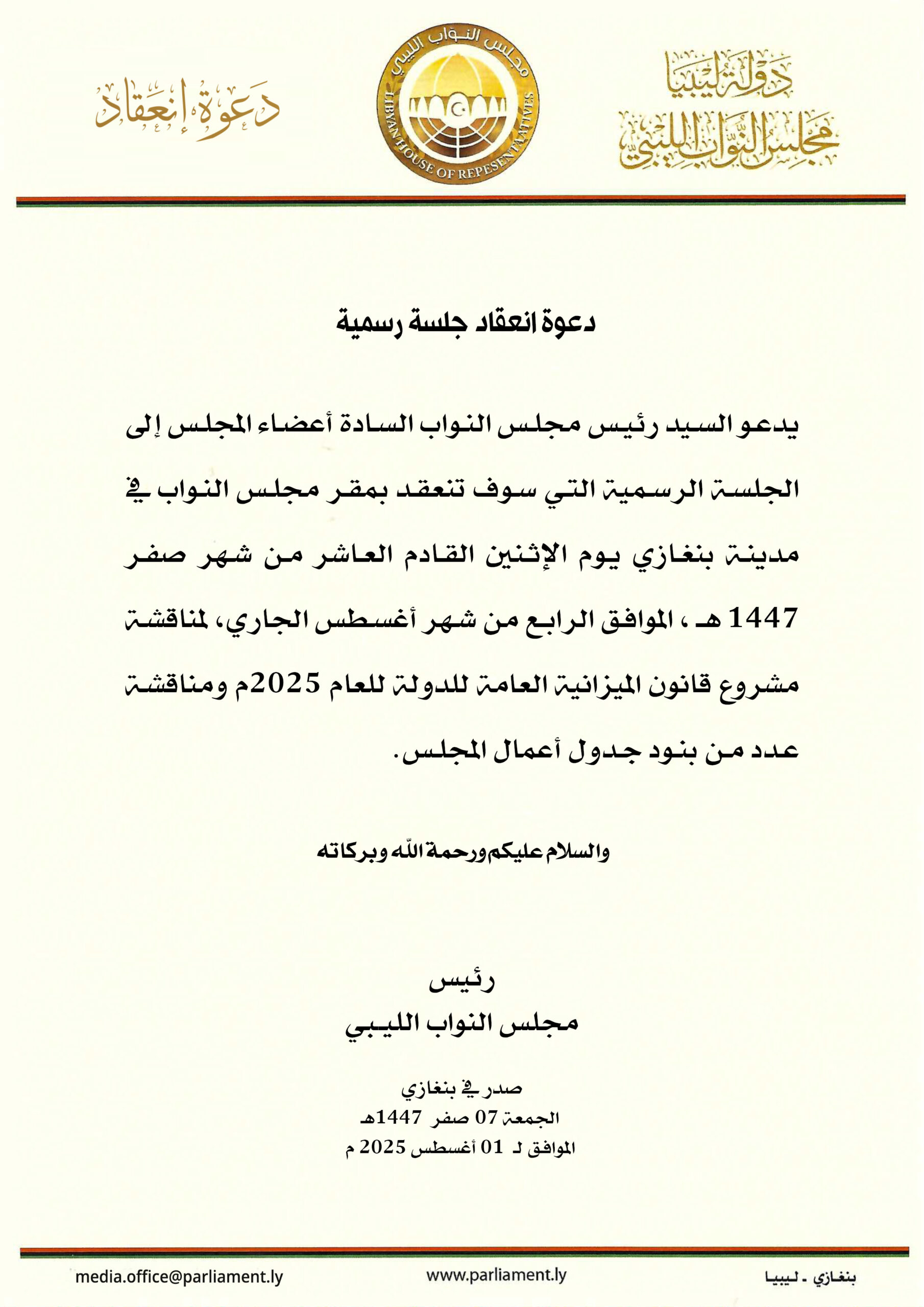 السيد رئيس مجلس النواب يدعو السادة أعضاء المجلس لجلسة رسمية