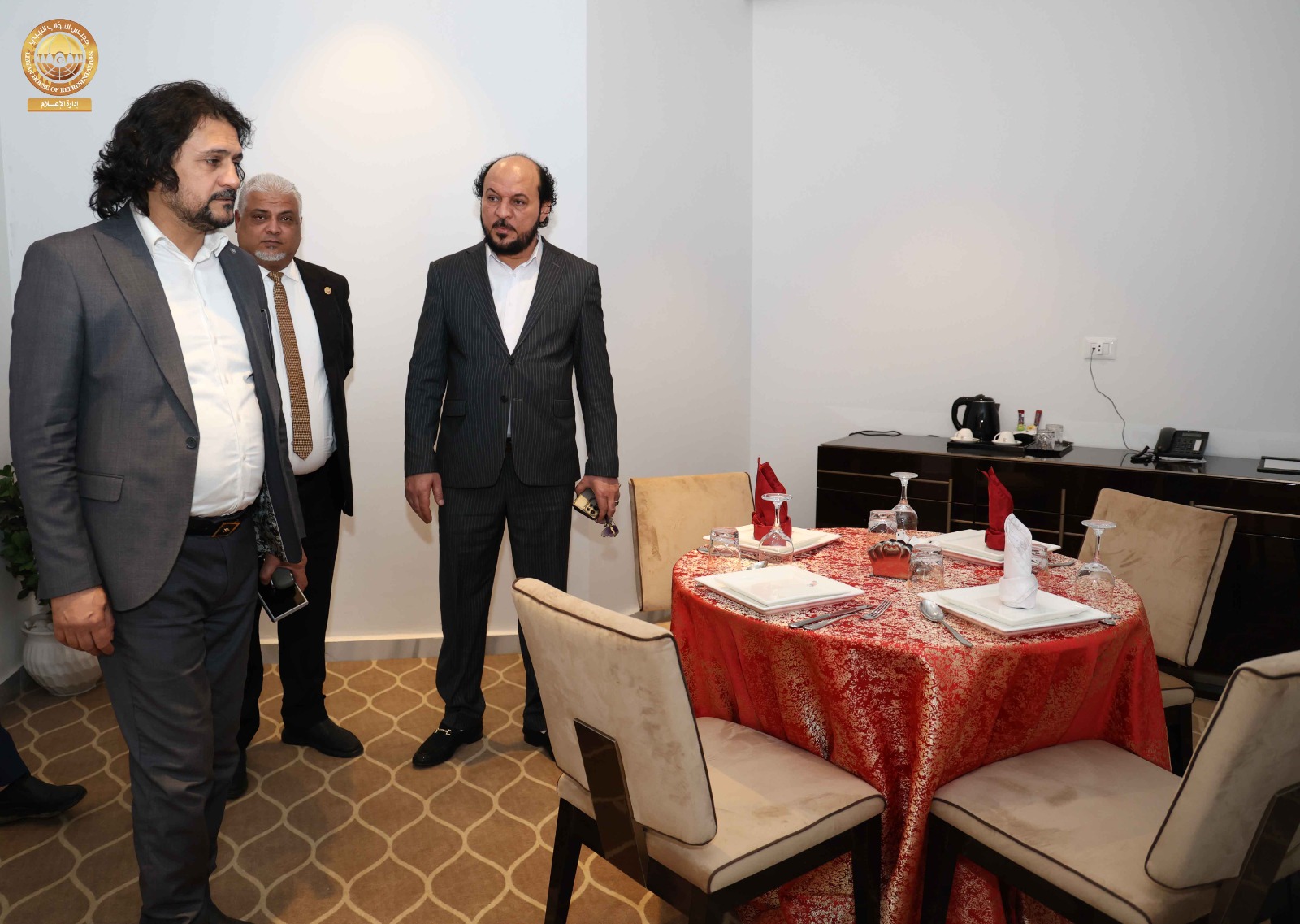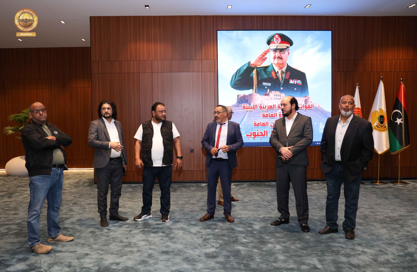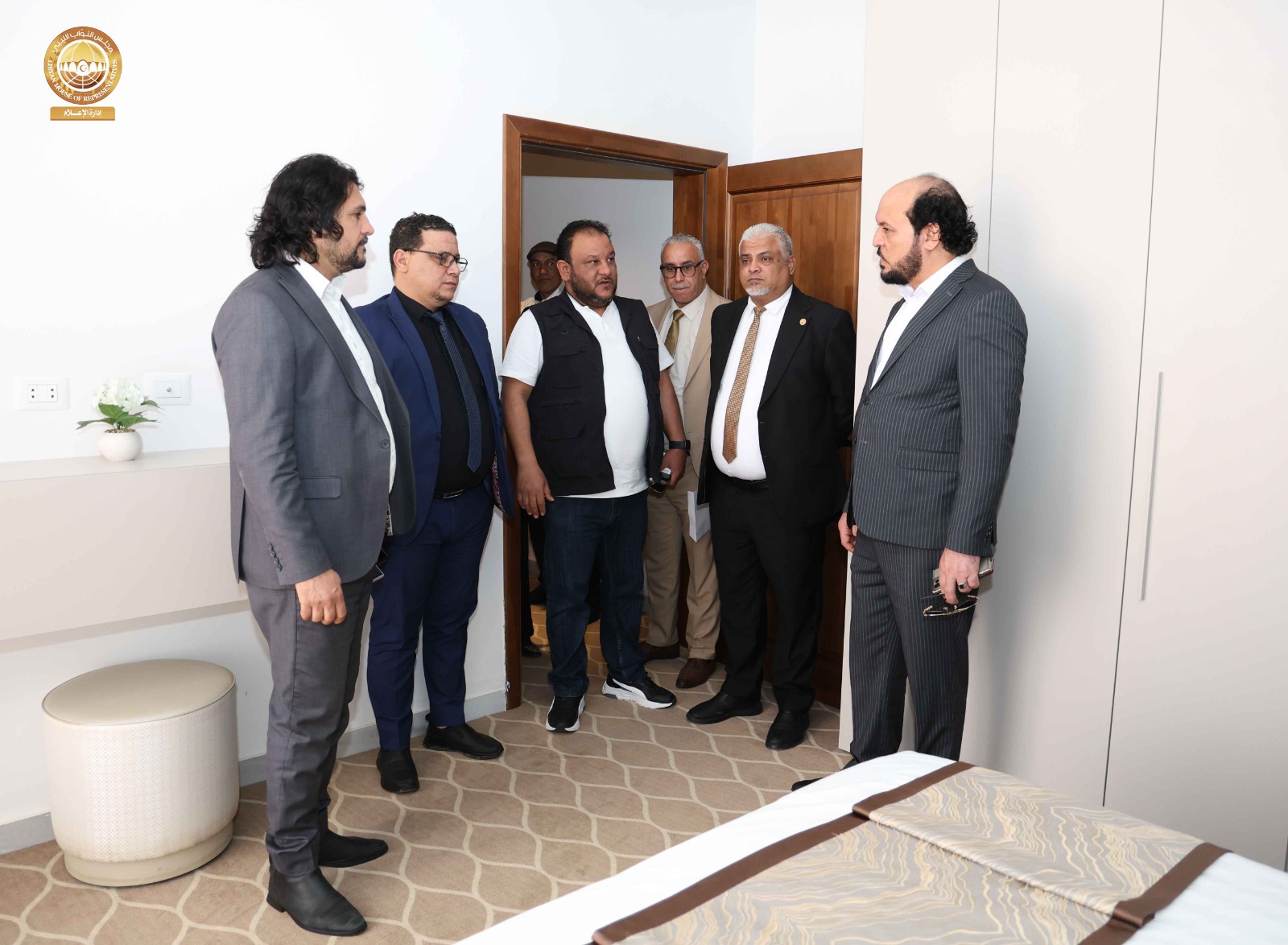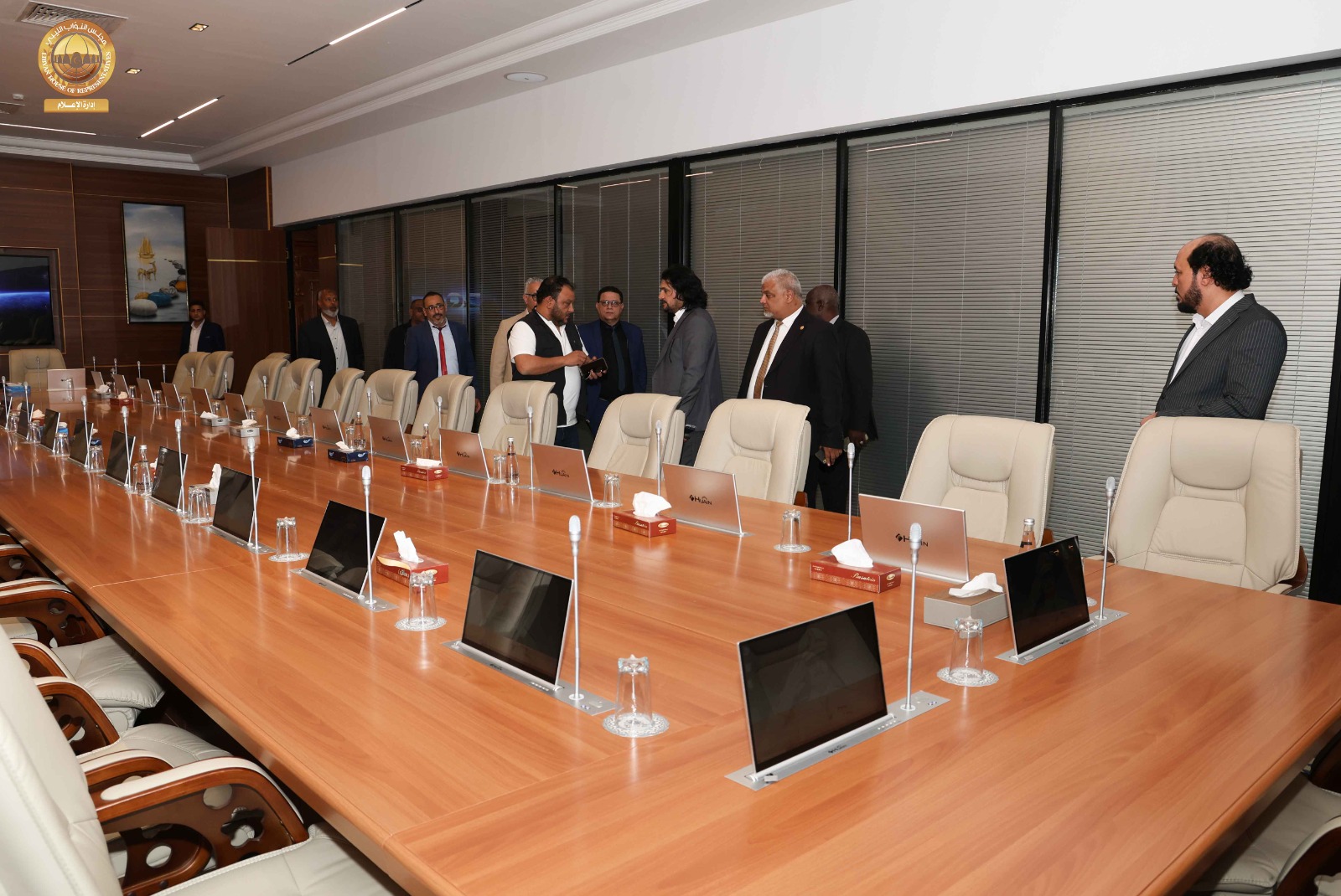 حيث قامت اللجنة برئاسة ” مدير إدارة العلاقات بالديوان السيد ” إدريس الفرجاني وعضوية السادة ” مدير إدارة الإعلام المتحدث الرسمي باسم المجلس” عبد الله بليحق، و مدير إدارة التقنية والمعلومات ” م. حاتم الترهوني “، و مدير إدارة الخدمات ” مفتاح المهدوي، و مدير إدارة المشروعات “م. عبد الواحد المدير ” رفقة عضو مجلس النواب عن مدينة سبها السيد ” أحمد الشارف ” ومدير فرع الديوان في سبها ” محمد سويسي” والمكلّف بالإشراف والمتابعة لمشاريع صندوق التنمية وإعادة إعمار ليبيا بالمنطقة الجنوبية السيد ” م. أحمد النمر ” قاموا بجولة شملت القاعة الرئيسية بالمدينة وقاعات الاجتماعات ومقرات الإقامة و الفنادق إلى جانب الاطلاع على مختلف التجهيزات الفنية واللوجستية ذات العلاقة باستضافة أعمال جلسة مجلس النواب.