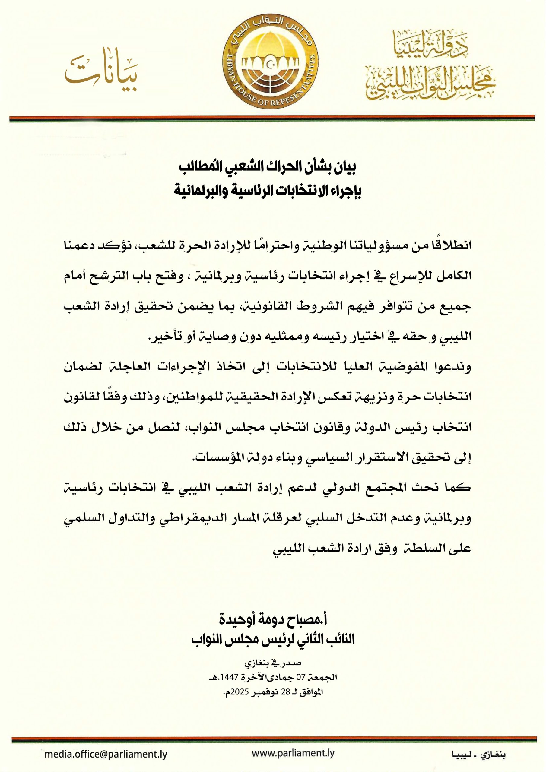 بيان النائب الثاني لرئيس مجلس النواب بشأن الحراك الشعبي المُطالب بإجراء الانتخابات الرئاسية والبرلمانية