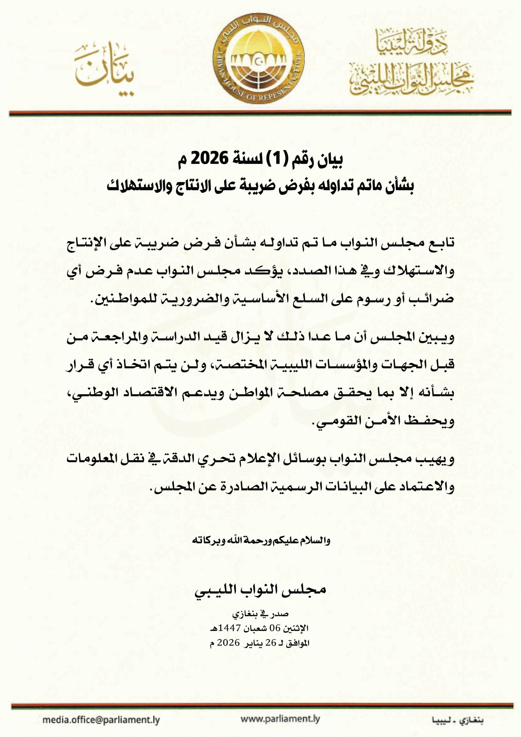 بيان رقم (1) لسنة 2026 م بشأن ماتم تداوله بفرض ضريبة على الانتاج والاستهلاك