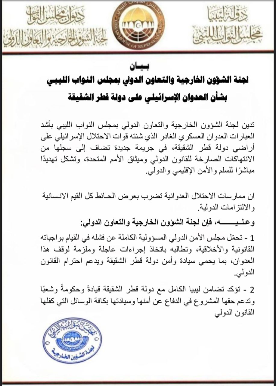 بيان لجنة الخارجية والتعاون الدولي بشأن العدوان الإسرائيلي على دولة قطر الشقيقة