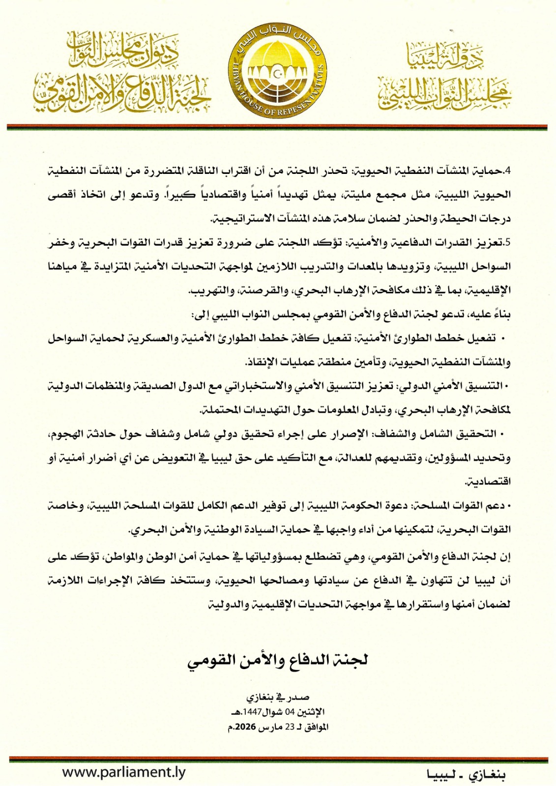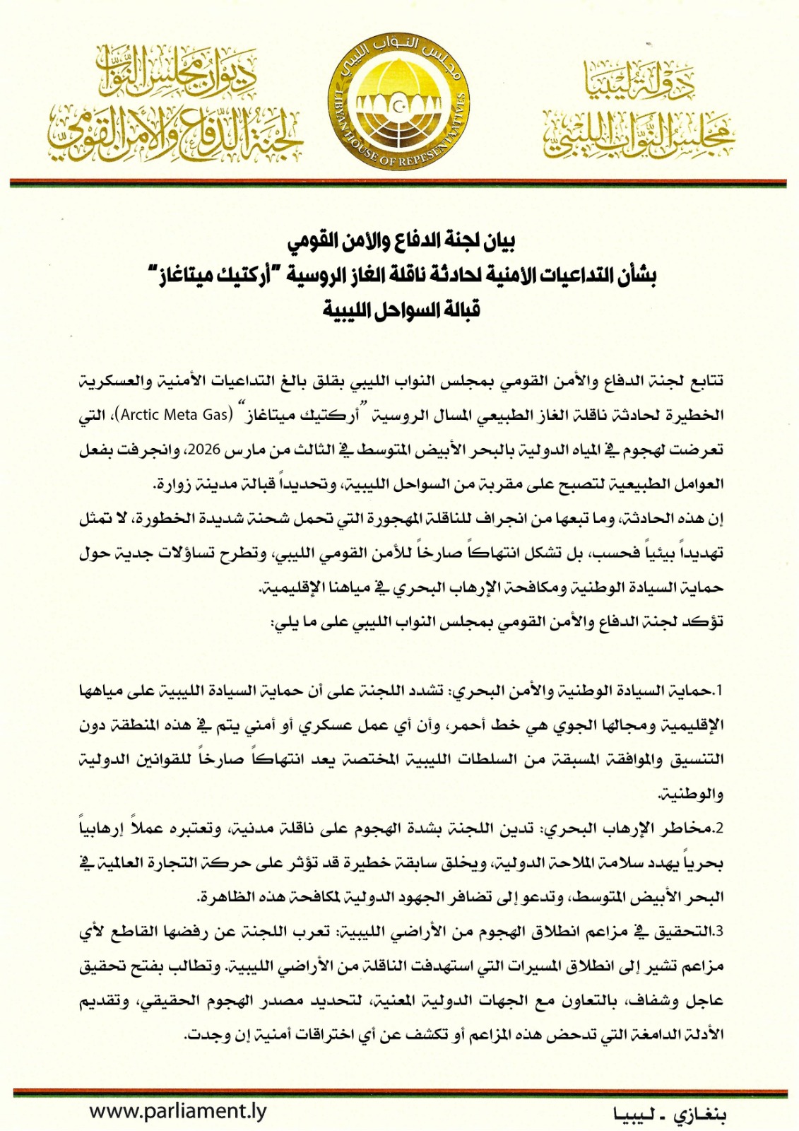 بيان لجنة الدفاع والأمن القومي بمجلس النواب الليبي بشأن التداعيات الأمنية لحادثة ناقلة الغاز الروسية “أركتيك ميتاغاز” قبالة السواحل الليبية مرتبط
