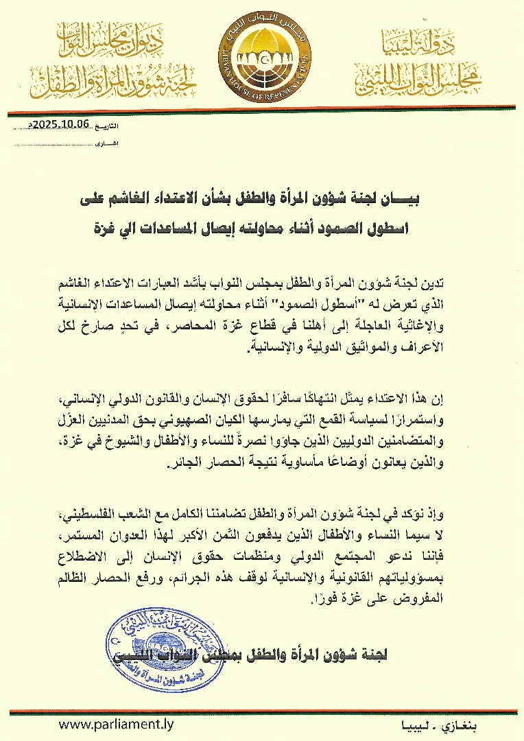 بيان لجنة شؤون المرأة والطفل بشأن الاعتداء الغاشم على اسطول الصمود أثناء محاولته إيصال المساعدات إلى غزة مرتبط