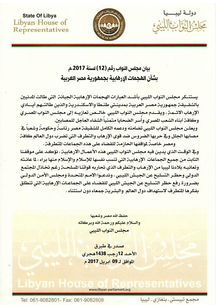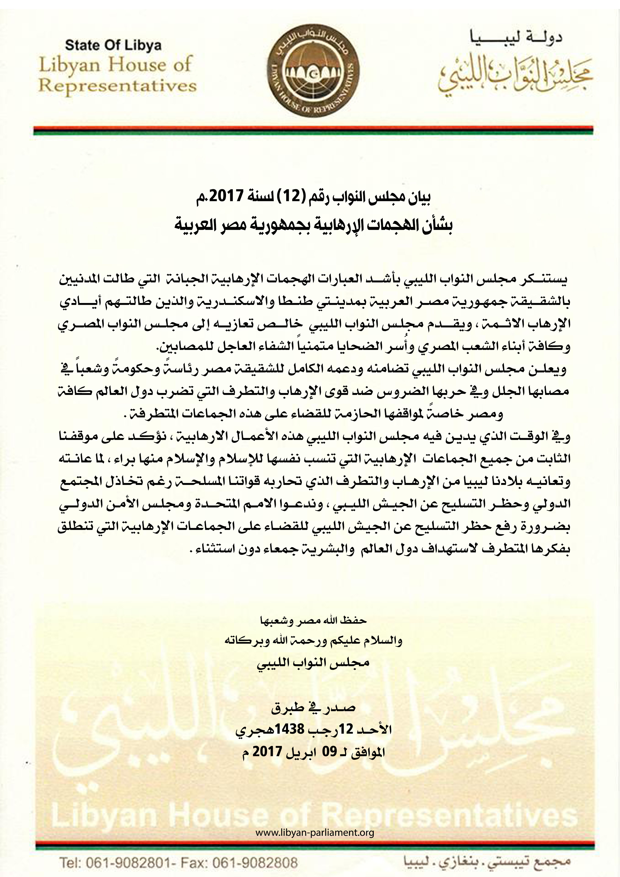 بيان مجلس النواب الليبي رقم (12) لسنة 2017.م بشأن الهجمات الإرهابية بجمهورية مصر العربية