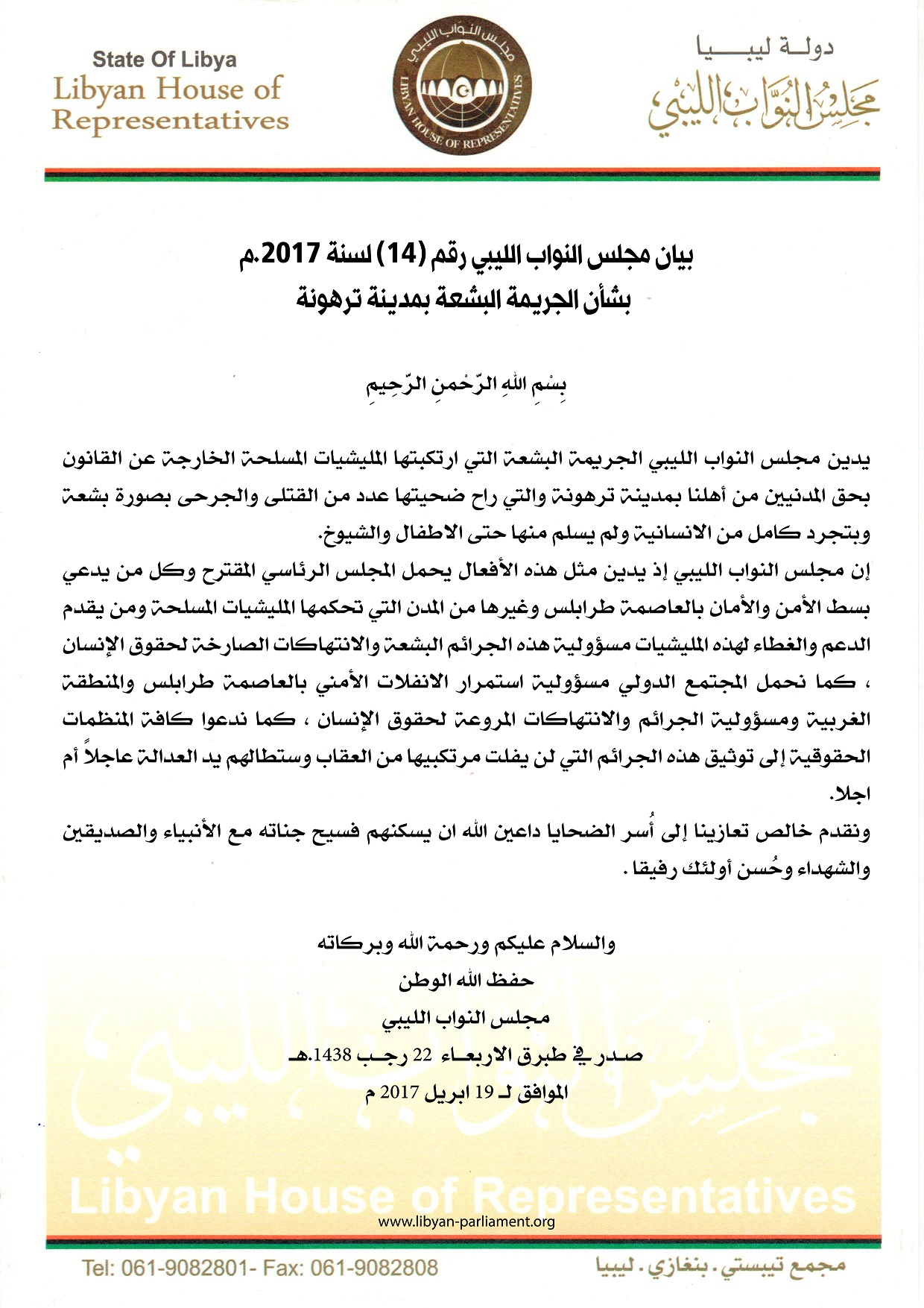 بيان مجلس النواب الليبي رقم (14) لسنة 2017.م بشأن الجريمة البشعة بمدينة ترهونة