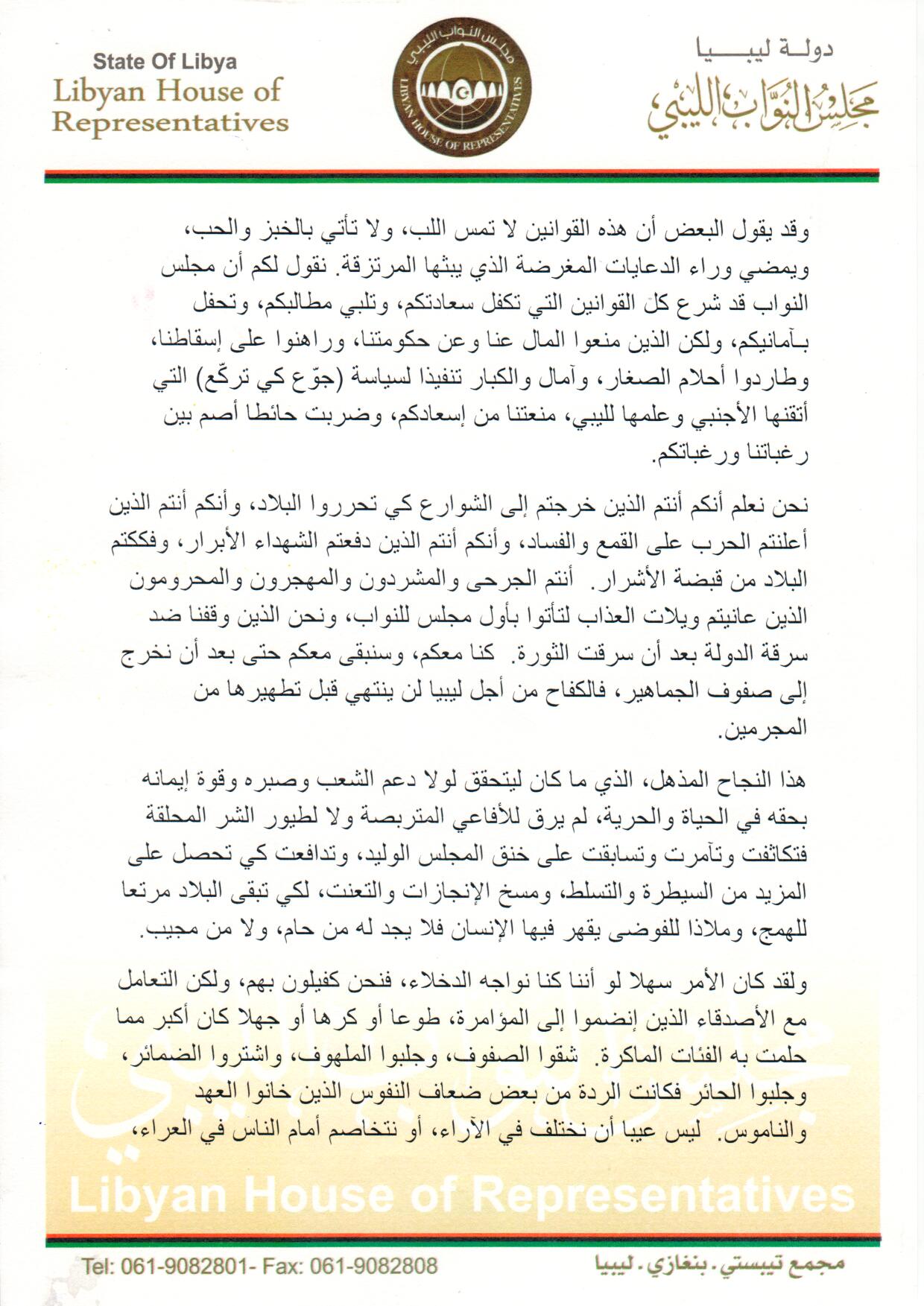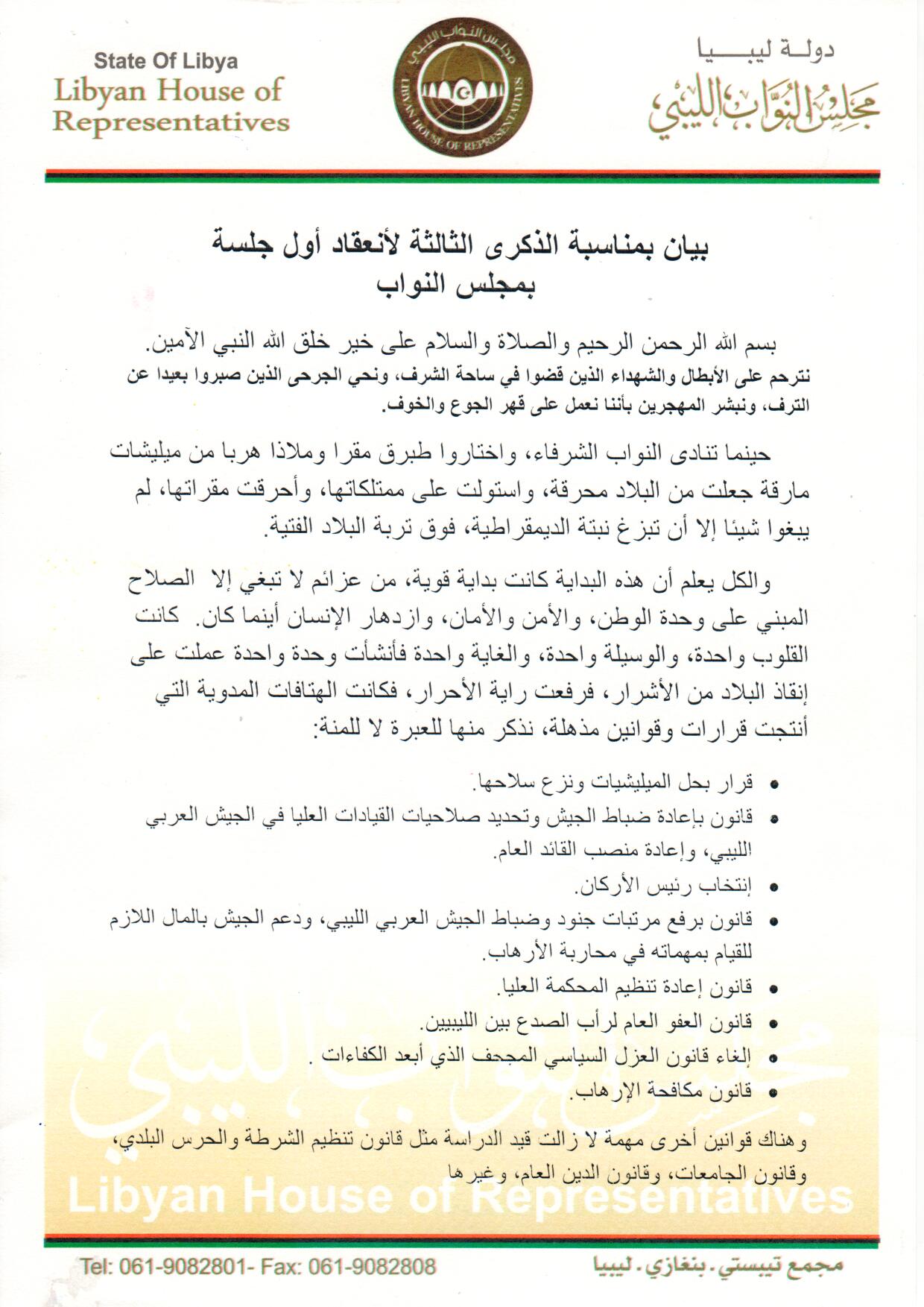 بيان مجلس النواب بمناسبة الذكرى الثالثة لإنعقاد أول جلسة