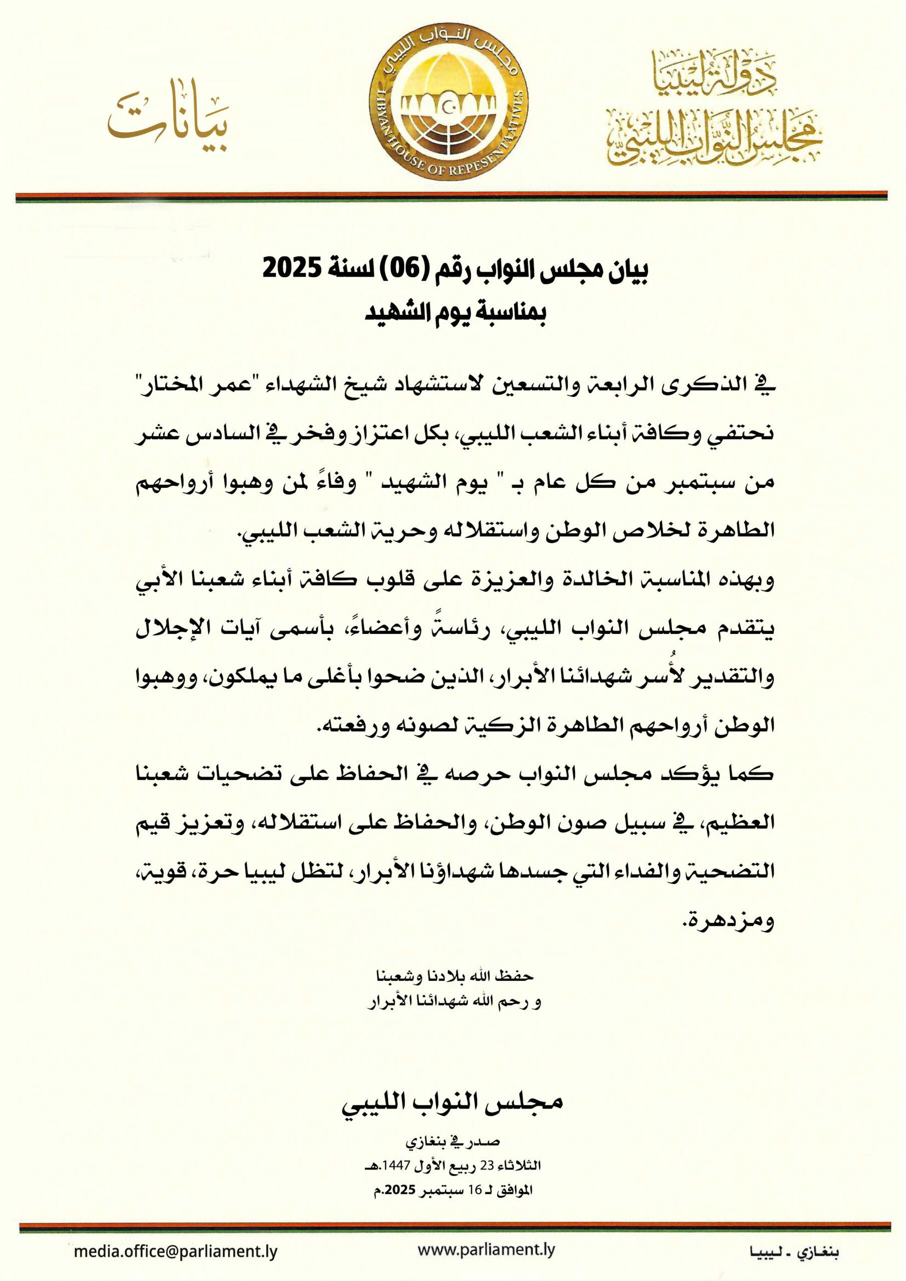 بيان مجلس النواب رقم (06) لسنة 2025م بمناسبة يوم الشهيد
