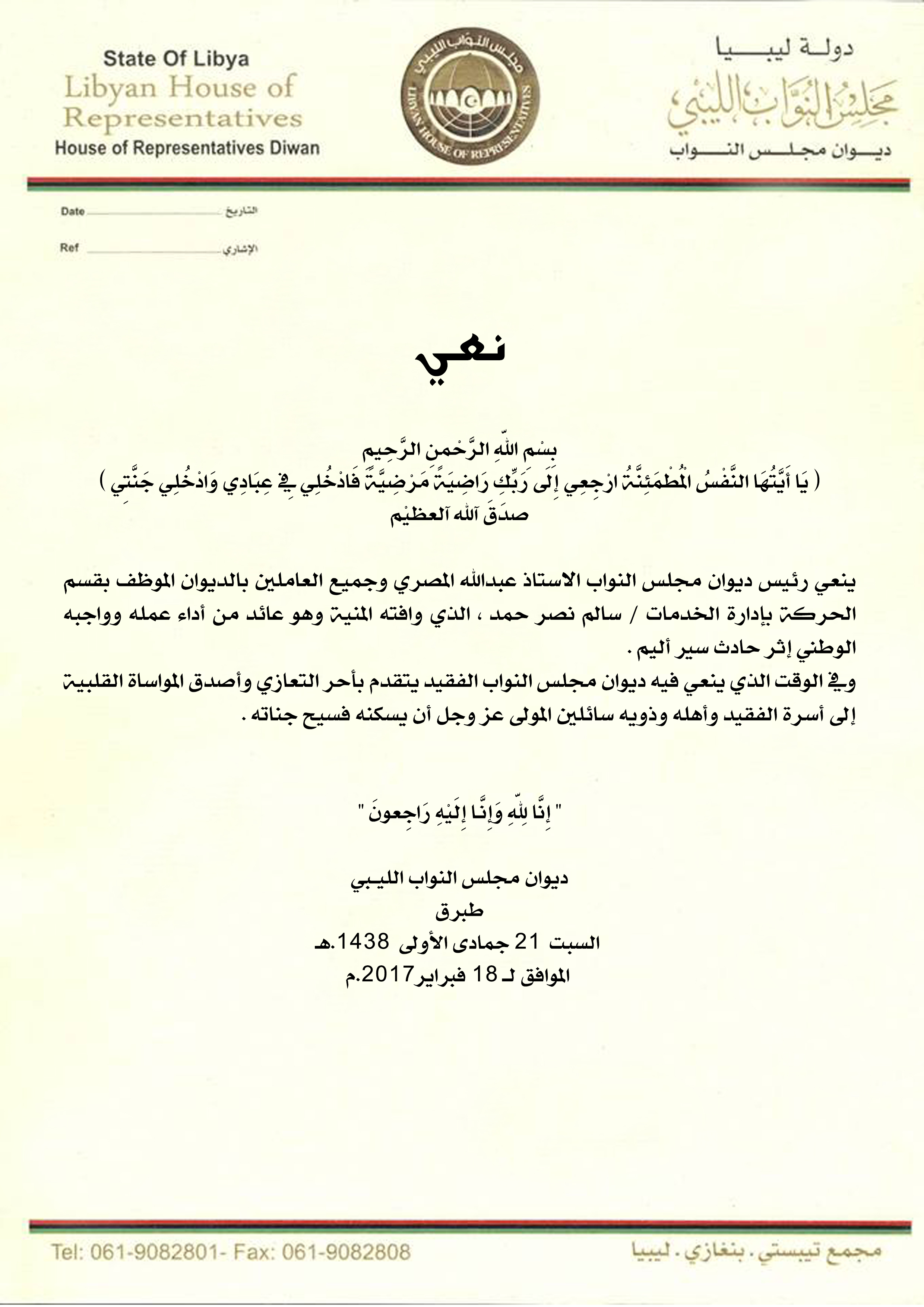 ديوان مجلس النواب ينعي أحد موظفيه