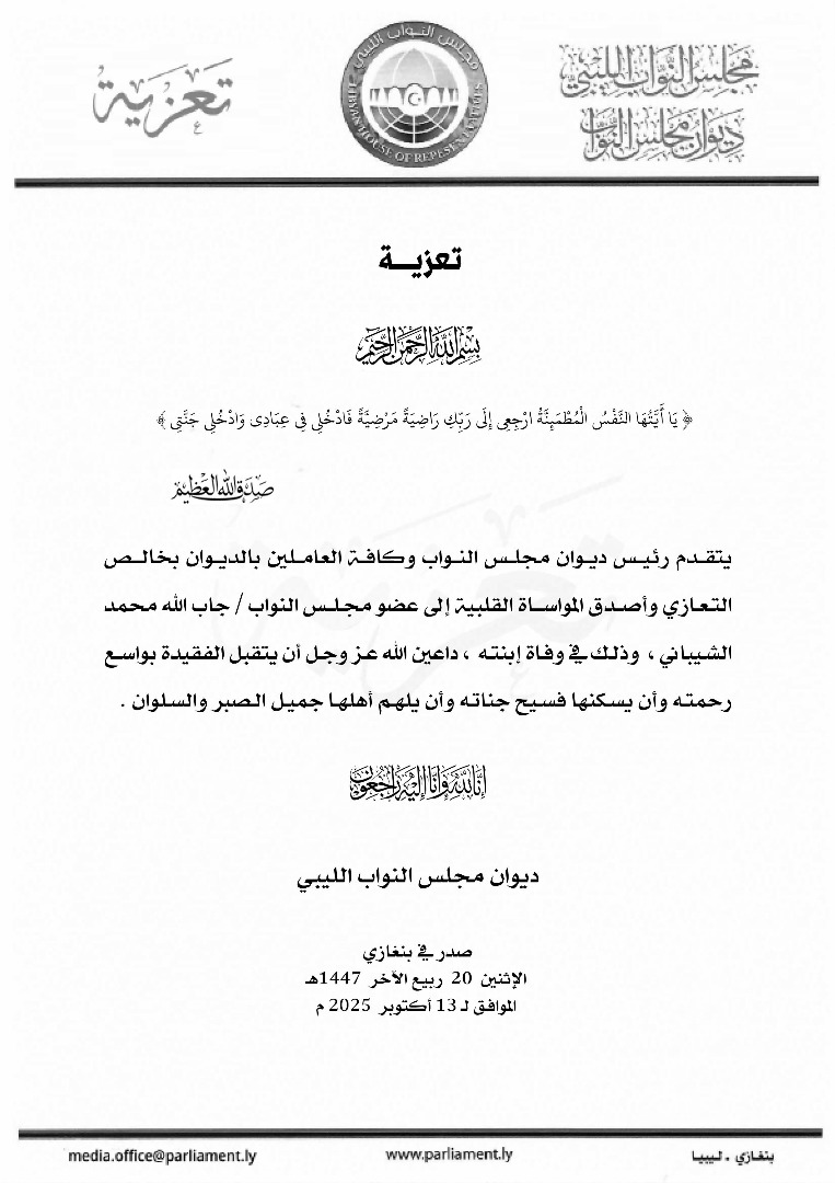 رئيس ديوان مجلس النواب يتقدم بالتعزية للنائب جاب الله محمد الشيباني في وفاة إبنته
