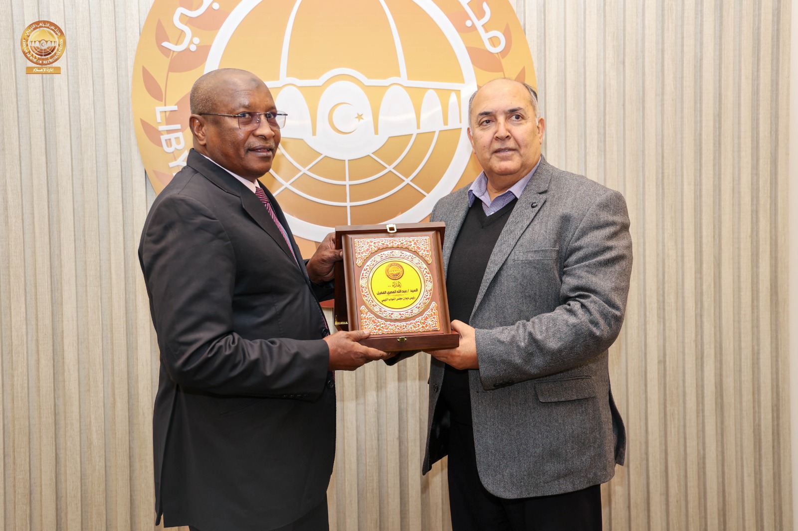 وفي ختام اللقاء قدم السيد رئيس ديوان مجلس النواب درعاً تذكارياً لسفير جمهورية تشاد.