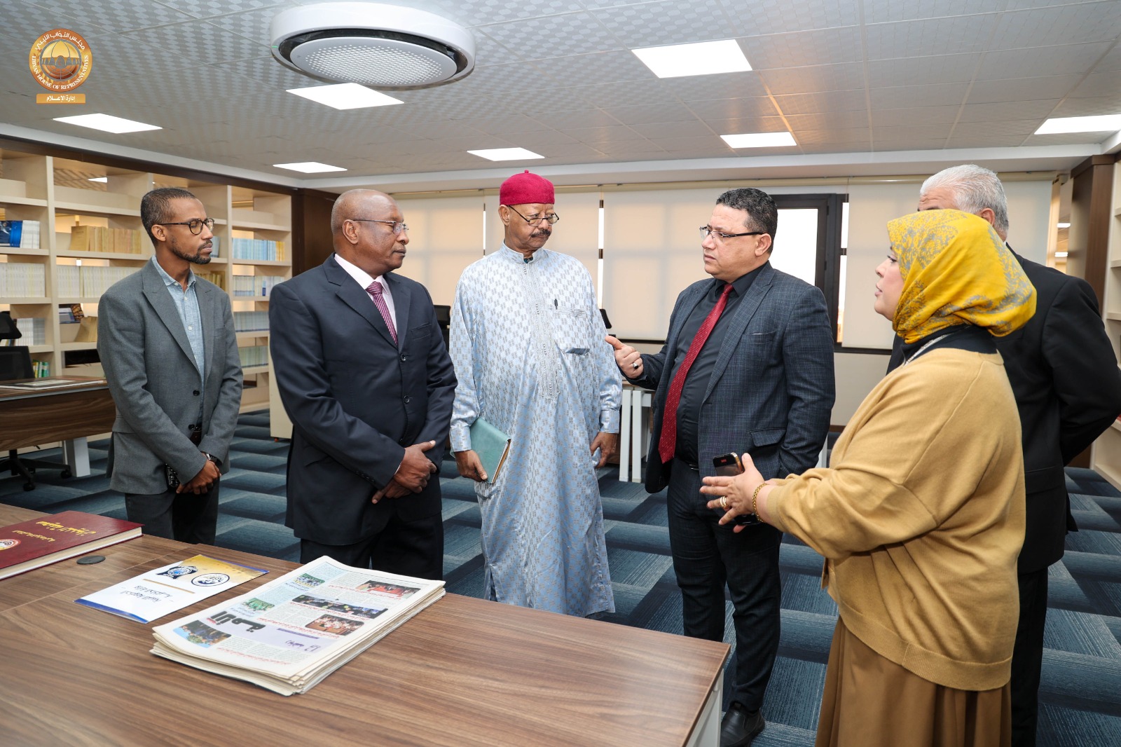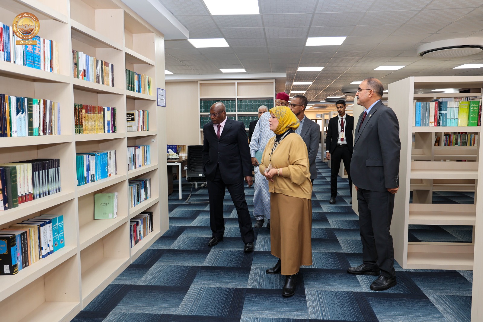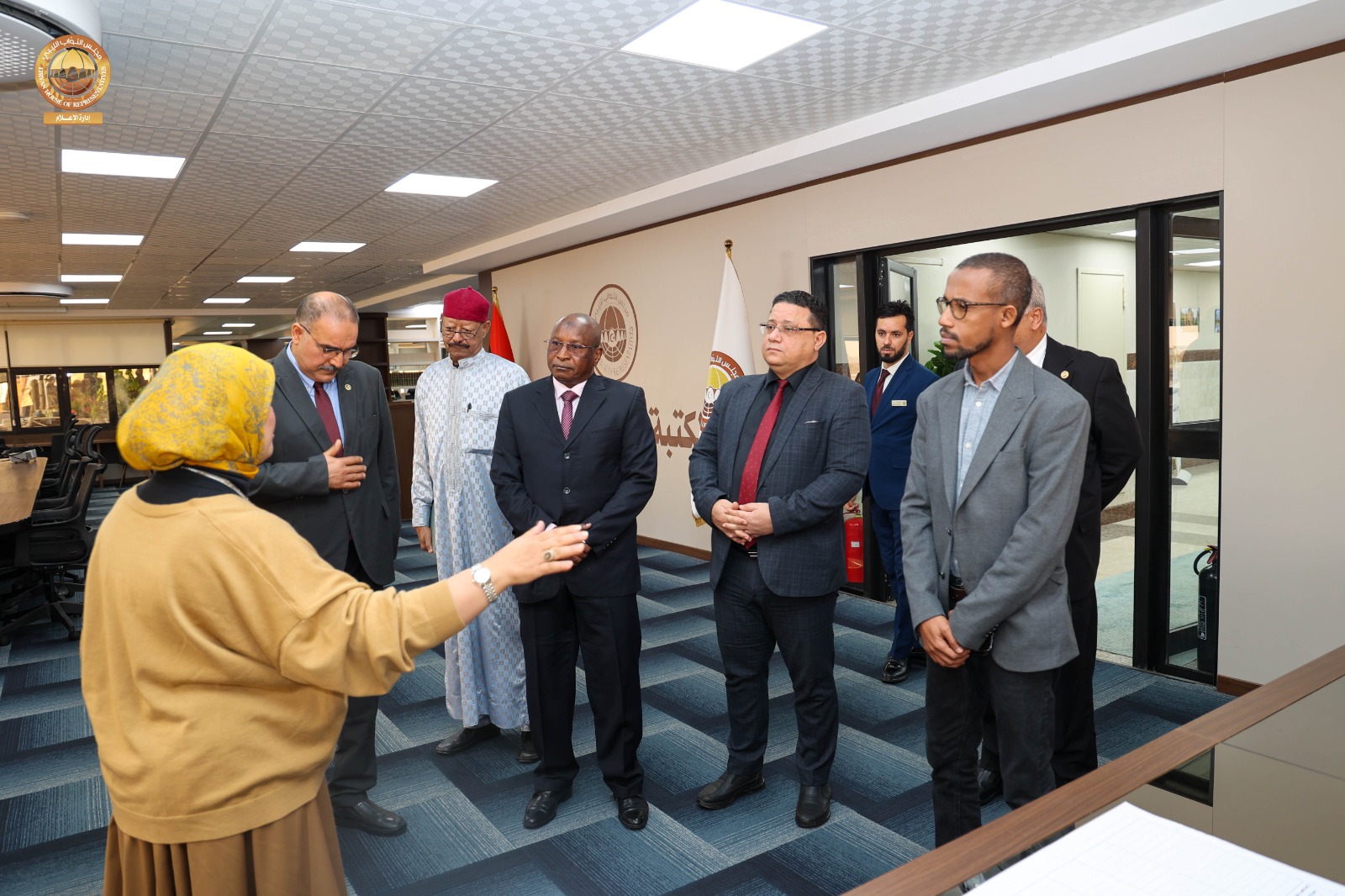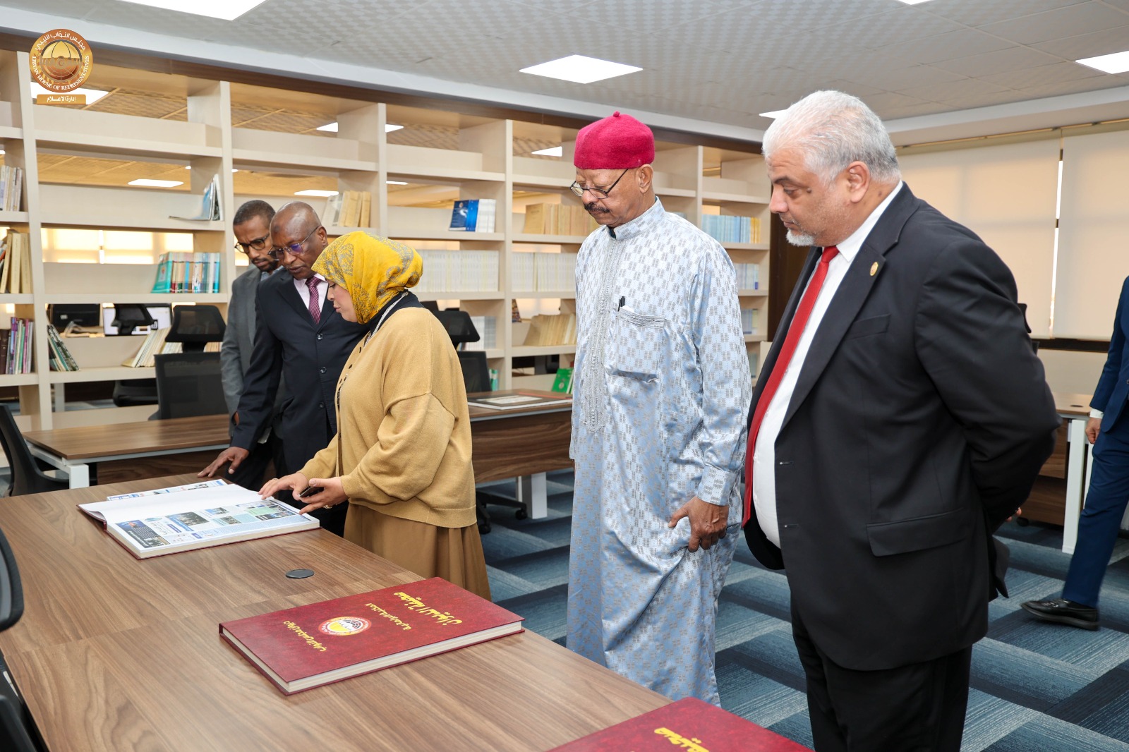 وعقب اللقاء قام سفير جمهورية تشاد لدى ليبيا رفقة عدد من مديري الإدارات وأمينة المكتبة البرلمانية بديوان مجلس النواب بزيارة للمكتبة البرلمانية بالديوان ، اطلع خلالها على محتويات المكتبة من كتب وموسوعات ووثائق، بالإضافة إلى وسائل الإيضاح الحديثة والمساحات المخصصة للقراءة والاطلاع التي توفر بيئة مثالية لرواد المكتبة، كما قام بجولة داخل أقسام المكتبة، استمع فيها إلى شروح وافية من القائمين على المكتبة حول طرق اقتناء الكتب، وفهرستها، وتصنيفها وفق أحدث الأساليب المعتمدة في علم المكتبات، كما اطّلع على المكتبة الإلكترونية التي تتيح الوصول إلى الكتب والمصادر والمراجع بصيغ رقمية.