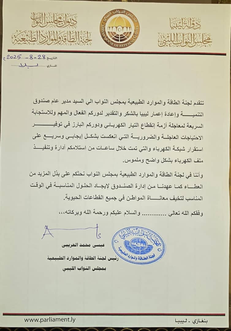رئيس لجنة الطاقة والموارد الطبيعية بمجلس النواب يتقدم بشكره لمدير عام صندوق التنمية وإعادة إعمار ليبيا لاستجابته السريعة لحل أزمة الكهرباء مرتبط
