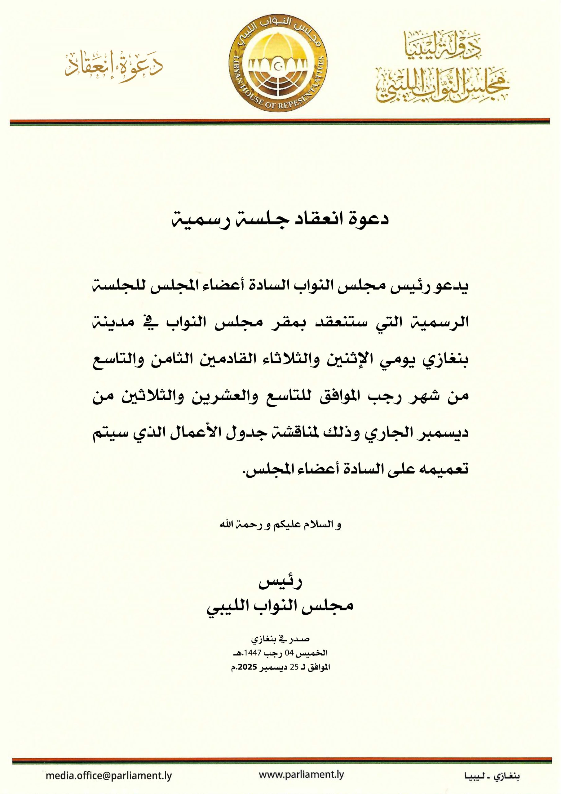 رئيس مجلس النواب يدعو السادة أعضاء المجلس لجلسة رسمية