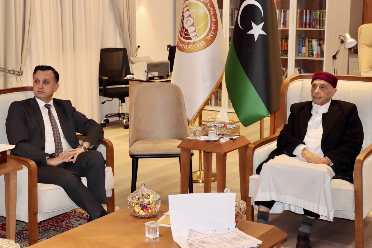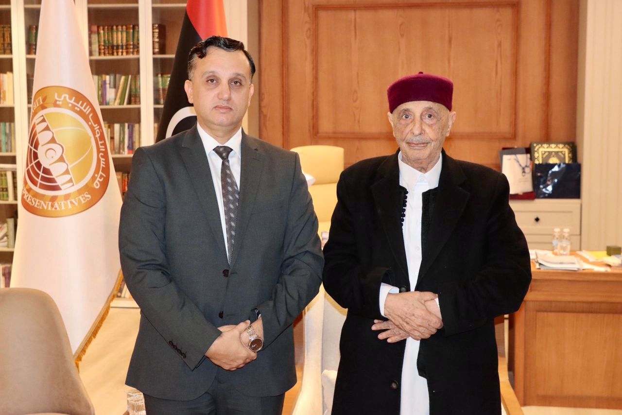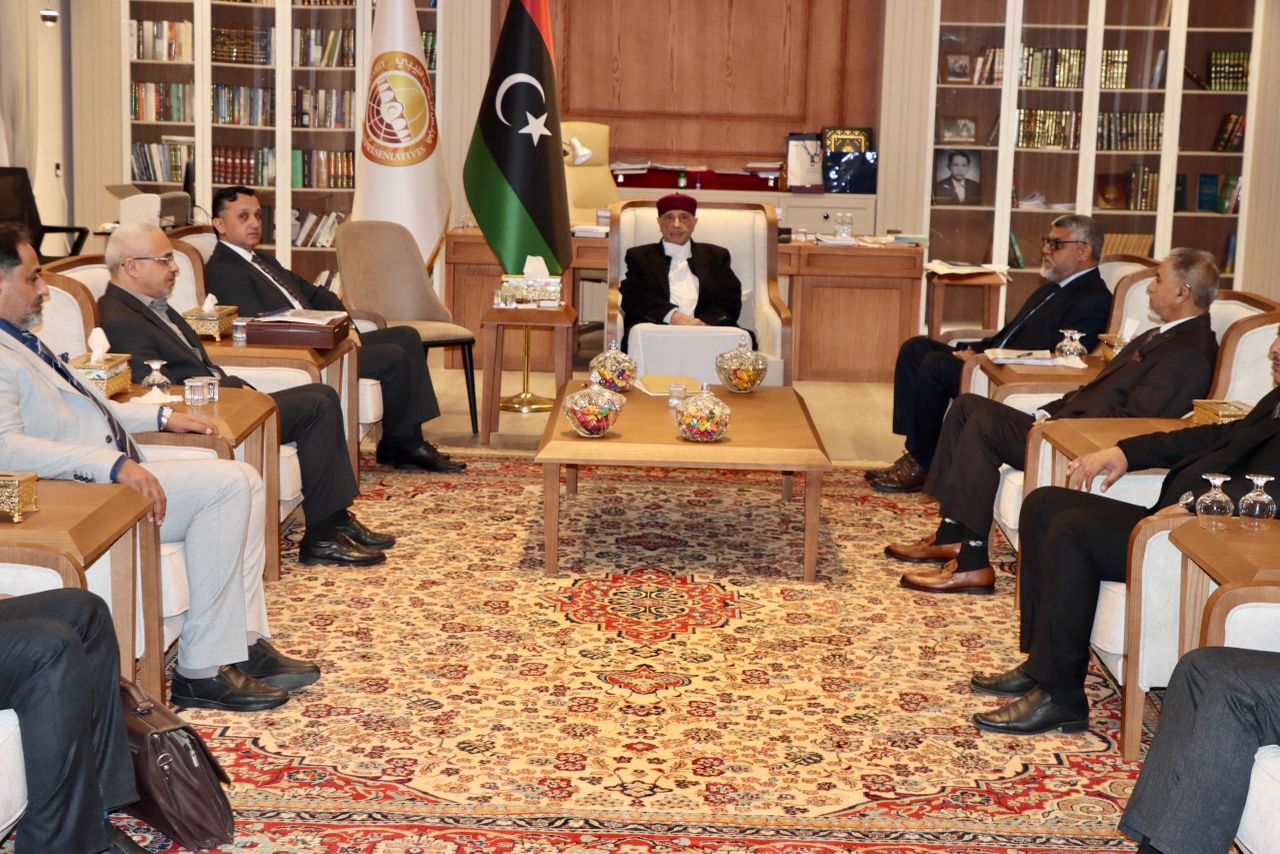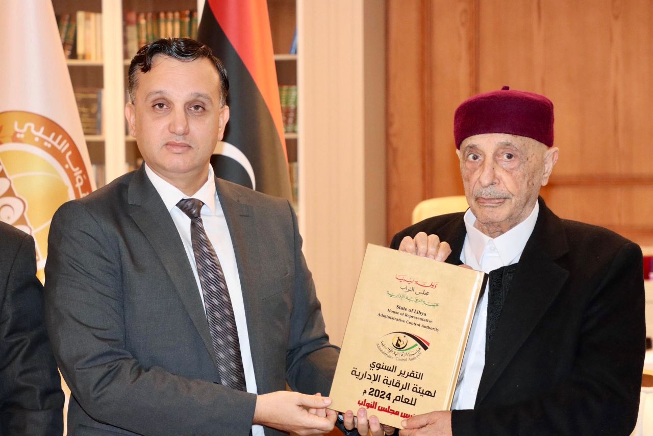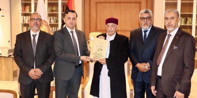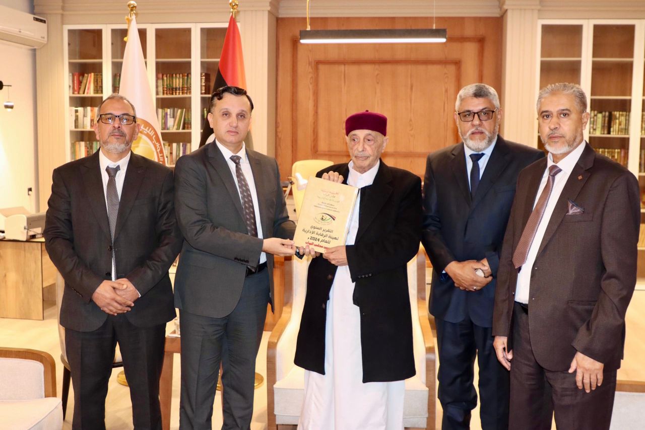 إلتقى السيد رئيس مجلس النواب المستشار “عقيلة صالح ” بمكتبه في مدينة القبة رئيس هيئة الرقابة الإدارية السيد “خالد نجم” رفقة السادة مديري الإدارات العامة والمكاتب بالهيئة ، وخلال اللقاء سلّم رئيس هيئة الرقابة الإدارية للسيد رئيس مجلس النواب التقرير السنوي لعام 2024.م للهيئة.