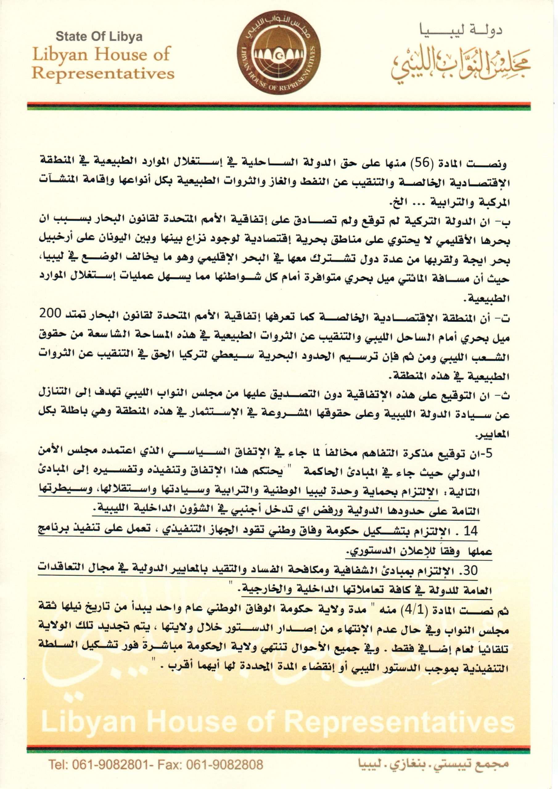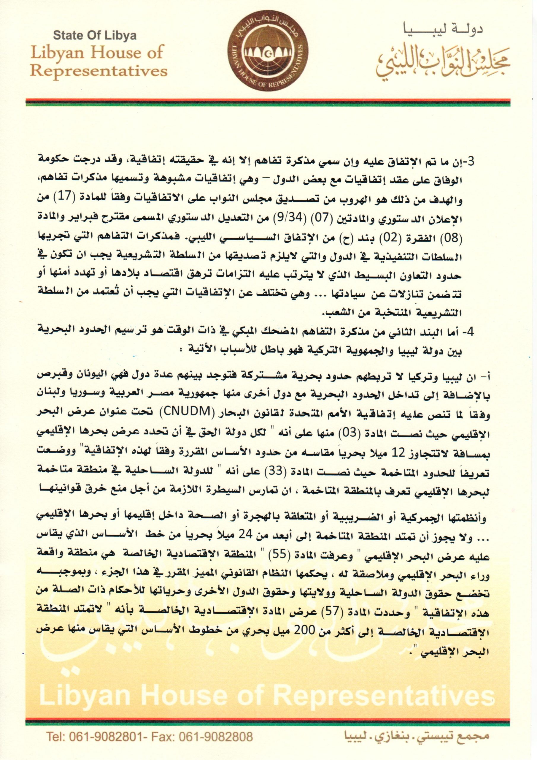 وارجع الخطاب الموجه من فخامة رئيس مجلس النواب لسعادة الأمين العام للأمم المتحدة التوقيع على هذه الاتفاقية دون التصديق عليها من مجلس النواب يهدف إلى التنازل على سيادة الدولة الليبية وحقوقها المشروعة بالاستثمار في هذه المنطقة، مؤكداً على أن مذكرة التفاهم الموقعة بين رئيس حكومة الوفاق والرئيس التركي مخالفة لما جاء في الاتفاق السياسي.