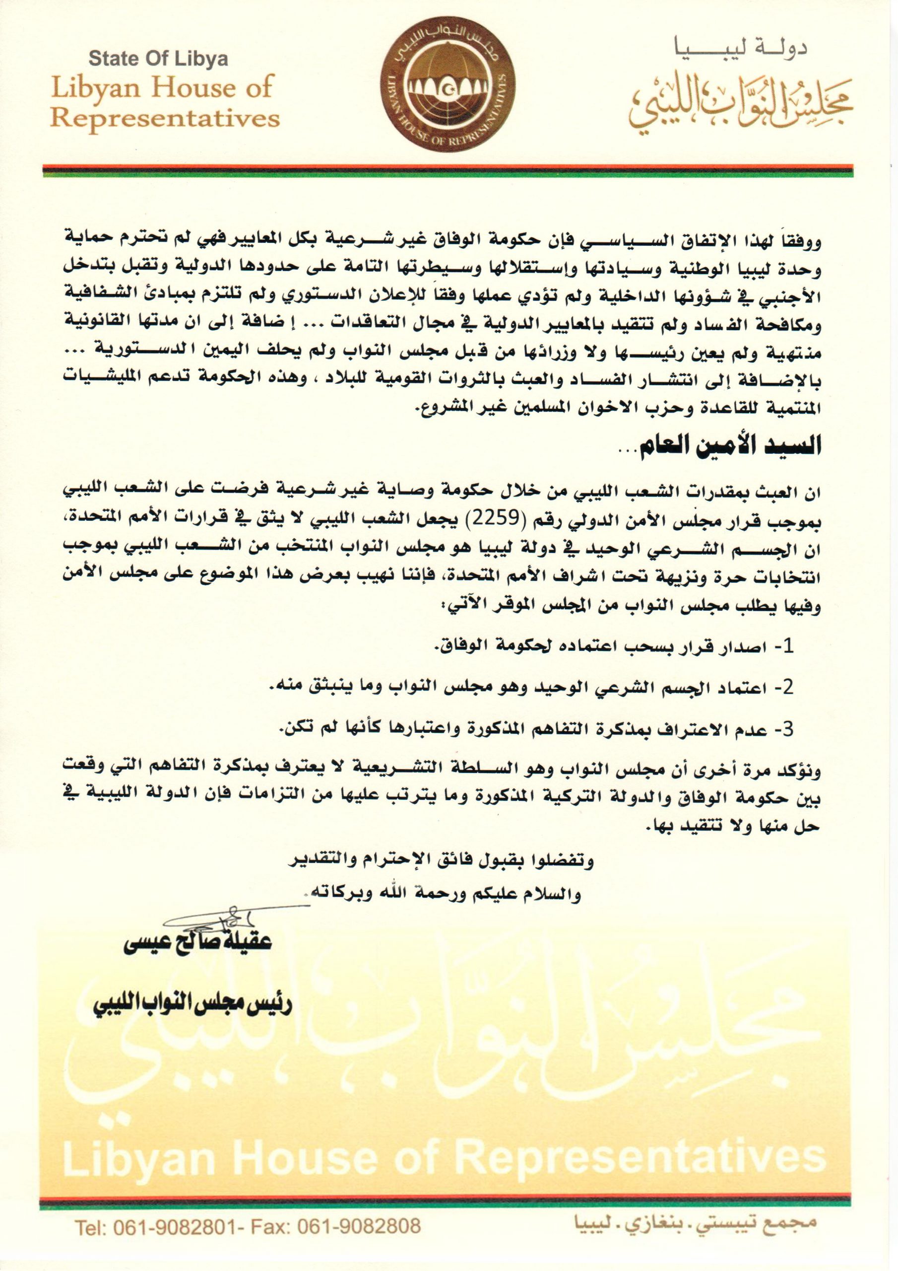 وطالب رئيس مجلس النواب في ختام خطابه لسعادة الامين العام للأمم المتحدة بإصدار قرارا بسحب اعتماده لحكومة الوفاق واعتماد الجسم الشرعي الوحيد وهو مجلس النواب وما ينبثق عنه وعدم الاعتراف بمذكرة التفاهم المذكورة واعتبارها كأنها لم تكن , مشدداً على أن السلطة التشريعية لا تعترف بمذكرة التفاهم التي وقعت بين حكومة الوفاق والدولة التركية وما يترتب عليها من التزامات لذلك فأن الدولة الليبية في حل منها ولا تتقيد بها .