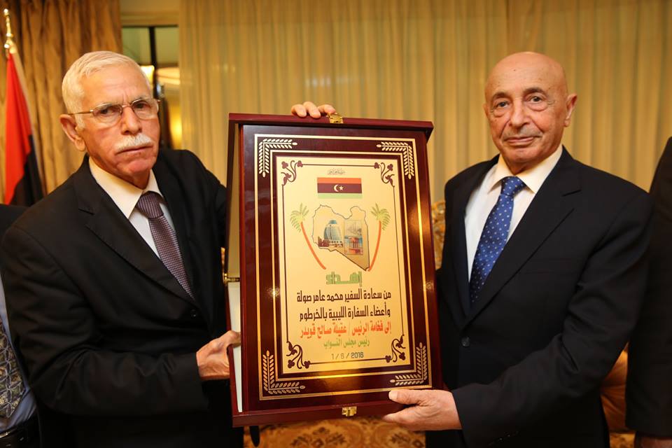 منح سعادة السفير محمد عامر صولة وأعضاء السفارة الليبية بالخرطوم درعاً إلى فخامة رئيس مجلس النواب الليبي المستشار “عقيلة صالح “، وذلك خلال مشاركة فخامته في الدورة (68) للجنة التنفيذية لاتحاد البرلماني الافريقي بالعاصمة السودانية الخرطوم .