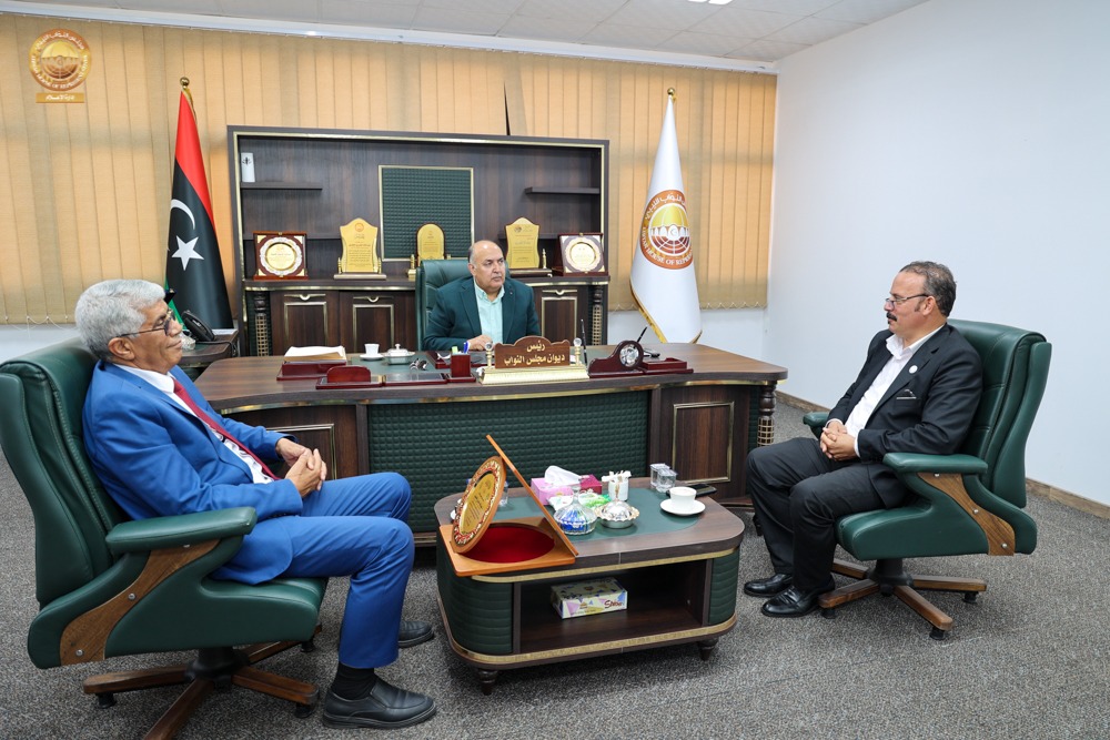 بحضور رئيس لجنة الأجهزة الرقابية بمجلس النواب السيد ” زايد هدية ” ونائب رئيس لجنة الصحة بالمجلس الدكتور ” حسن الزرقاء ” كرّم عميد كلية الاقتصاد بجامعة بنغازي ” أ.د أحمد الزروق ” السيد رئيس ديوان مجلس النواب الأستاذ “عبدالله المصري الفضيل ” بمنحه درعاً تقديراً لدعمه اللامحدود وجهوده المتميزة في إنجاح فعاليات مؤتمر الوظيفة العامة في ليبيا : واقع ممارساتها وآفاقها المستقبلية الذي استضافه ديوان مجلس النواب ونظمته كلية الاقتصاد بجامعة بنغازي، كما حضر التكريم رئيس المؤتمر ” أ.د بشير العبار ” ونائب رئيس ديوان مجلس النواب ” د. رسمي بالروين “.