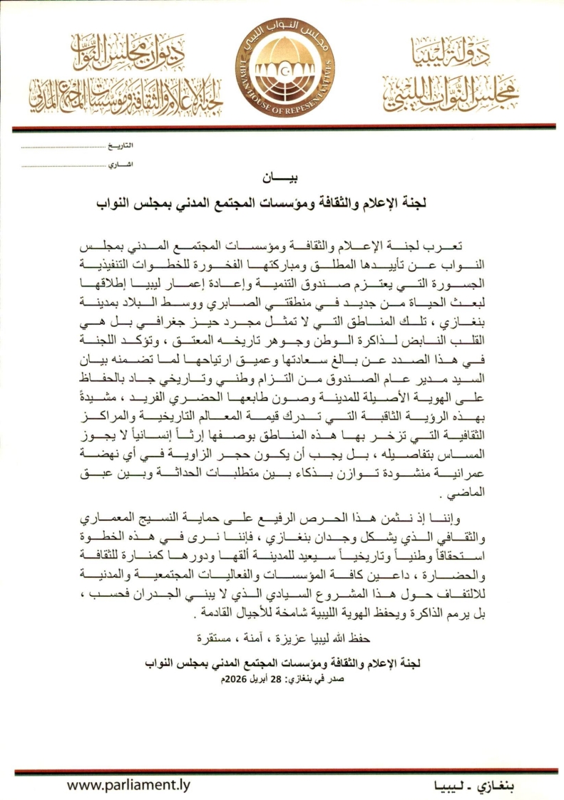 لجنة الإعلام والثقافة ومؤسسات المجتمع المدني بمجلس النواب تبارك الخطوات التنفيذية التي يعتزم صندوق التنمية وإعادة إعمار ليبيا إطلاقها لبعث الحياة من جديد في منطقتي الصابري ووسط البلاد بمدينة بنغازي