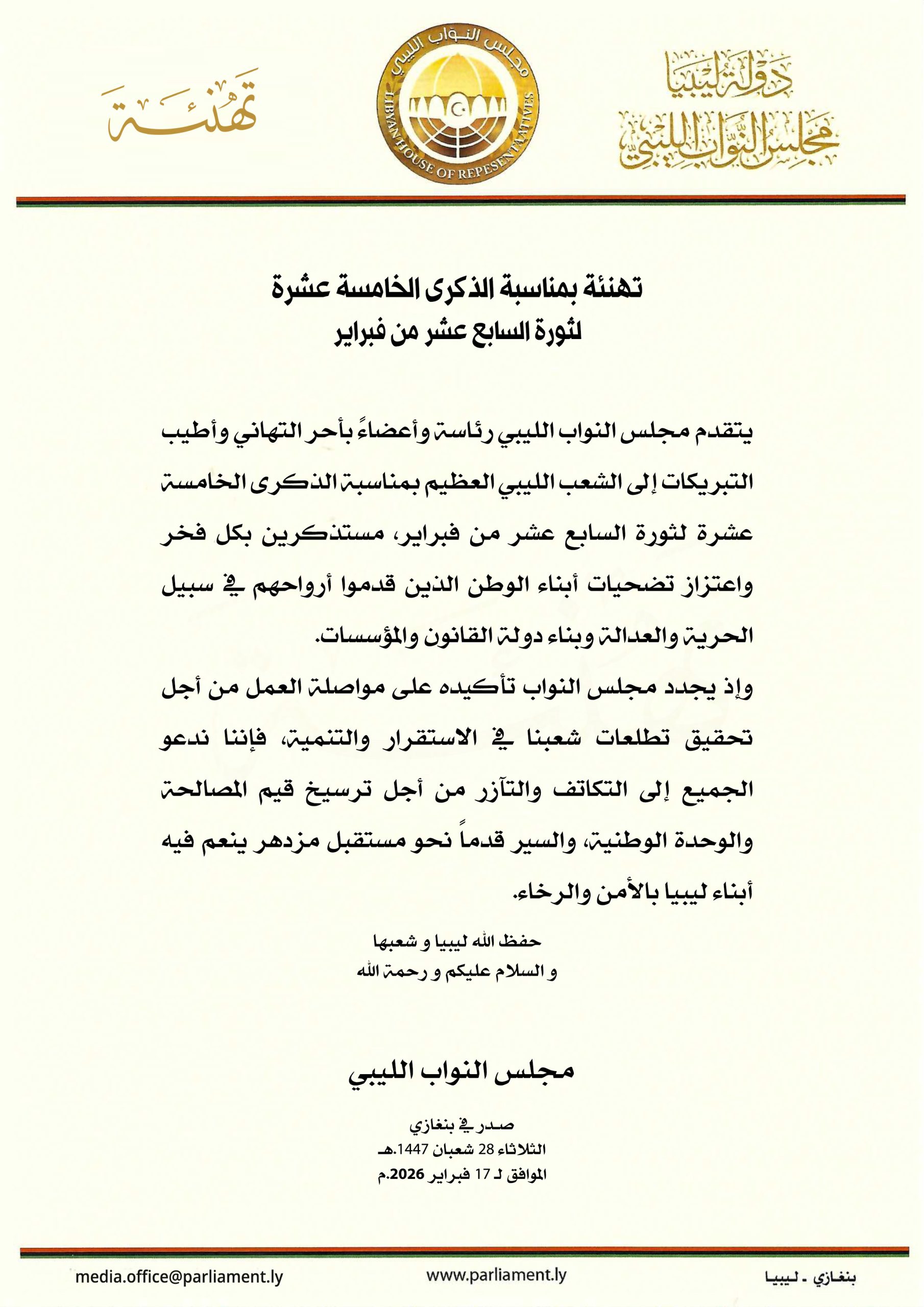 مجلس النواب يهنئ الشعب الليبي بمناسبة الذكرى الخامسة عشرة لثورة السابع عشر من فبراير