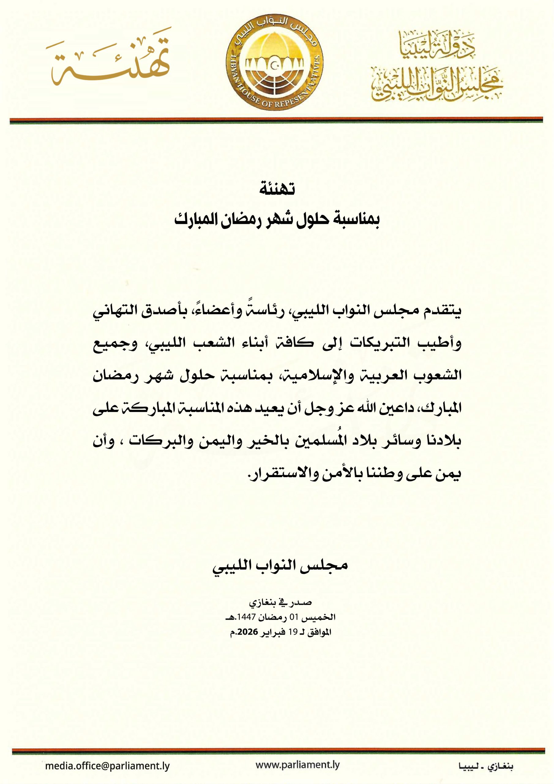 مجلس النواب يهنئ الشعب الليبي بمناسبة حلول شهر رمضان المبارك